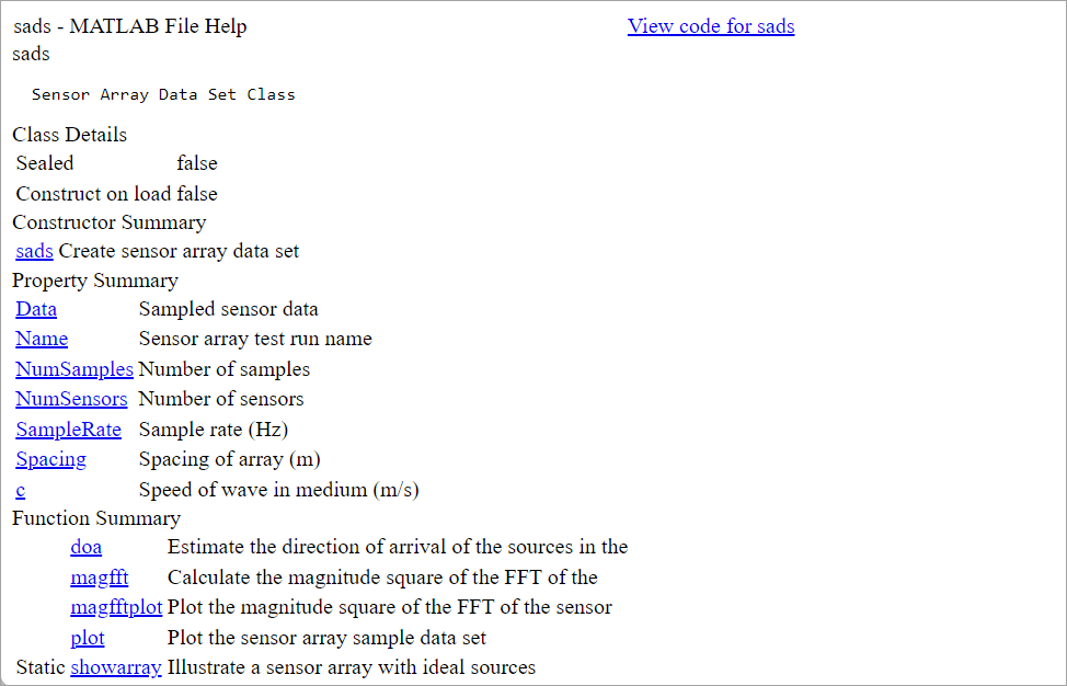 The file sads.m is an example custom class file. Display the formatted help text for the class. Because the help text follows MATLAB conventions, MATLAB displays the help text in a separate window.