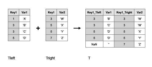 The output T has variables Key1_Tleft, Var1, Key1_Tright, and Var2, and combines all rows from both inputs, filling empty table elements with missing values.