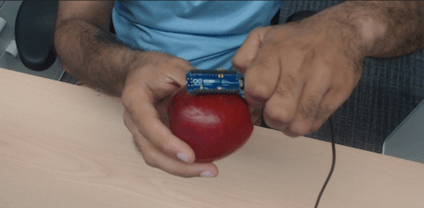 Place the Arduino Nano 33 BLE Sense board near the fruit for which you want to capture the RBG values. This image shows a person capturing the RBG data for an apple.