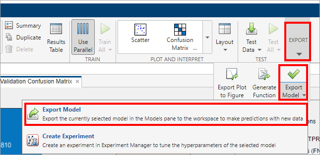 Use the Classification Learner app to determine the classification model and export the trained model.