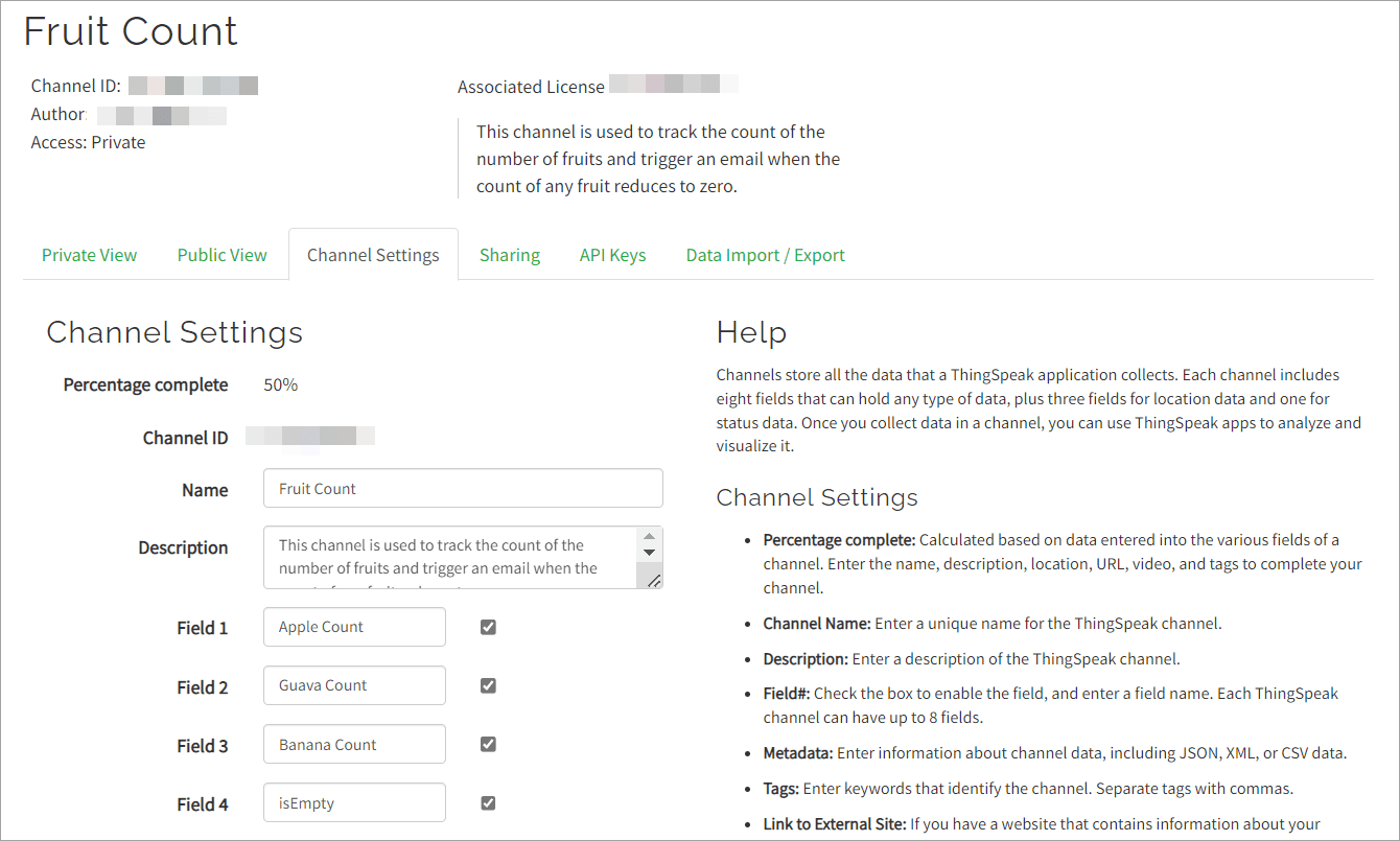 Create a ThingsSpeak channel to track the number of fruits in a box.