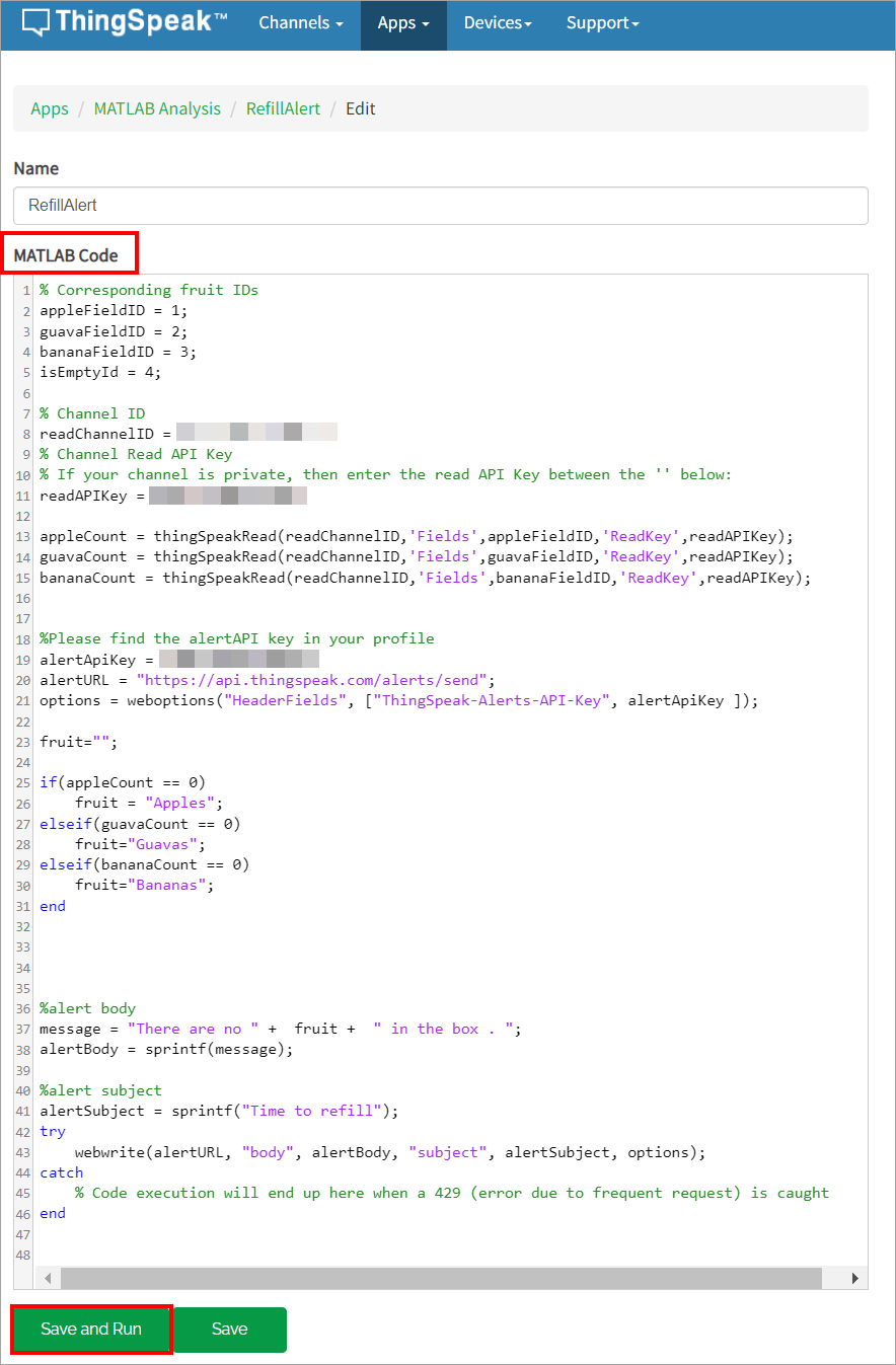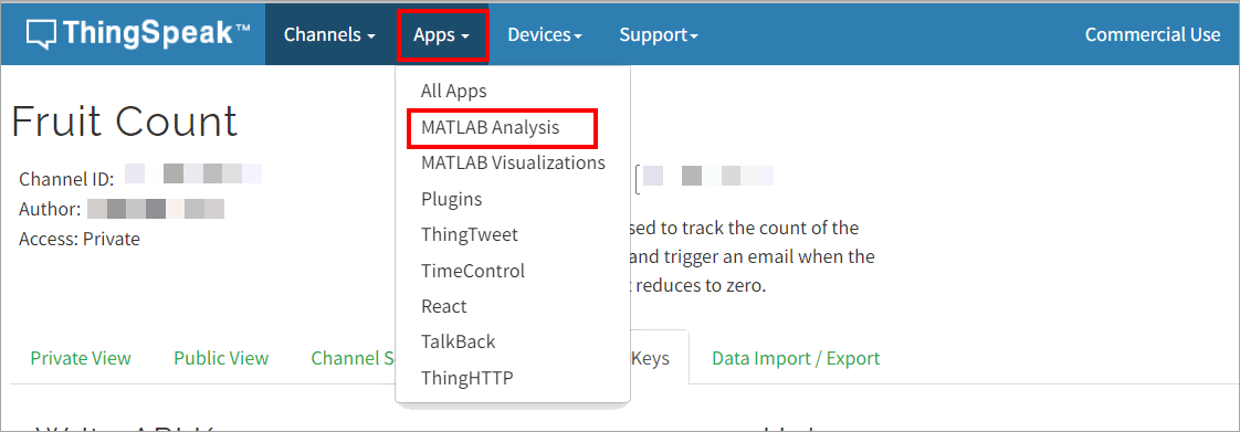 Before you write the MATLAB code to track the number of fruits, identify the API keys of the ThingSpeak channel. These keys allow you to read data from and write data to your channel.