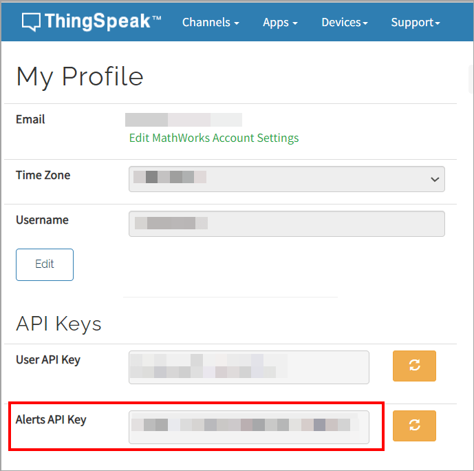 Specify the channel ID, Read API key, and Alerts API key corresponding to your channel in code. You can access the alerts key from your ThingSpeak profile page.