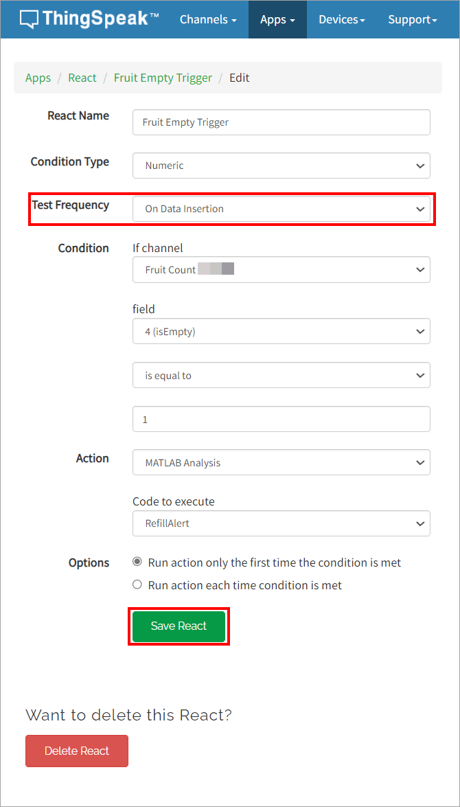To set up an email alert for when the number of any one of the three types of fruits drops to zero, on the Apps tab in ThingSpeak, click Actions, and then click React. In the React window, set these parameters.