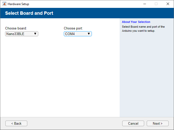 MKR1010,Nano 33 IoT,Nano 33 BLE, or theNano 33 BLE Senseboard, your computer running MATLAB can detect Bluetooth. This computer acts as a Bluetooth central.Click Finish to complete the hardware setup.