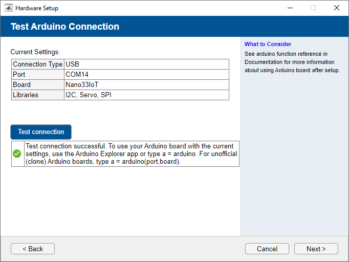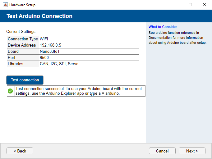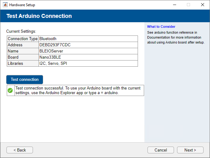 ESP32-DevKitV1orESP32-DevKitCboards, see Configure ESP32 Hardware over Bluetooth.Click Test connection to test the connection between your host computer and the Arduino board and click Next.