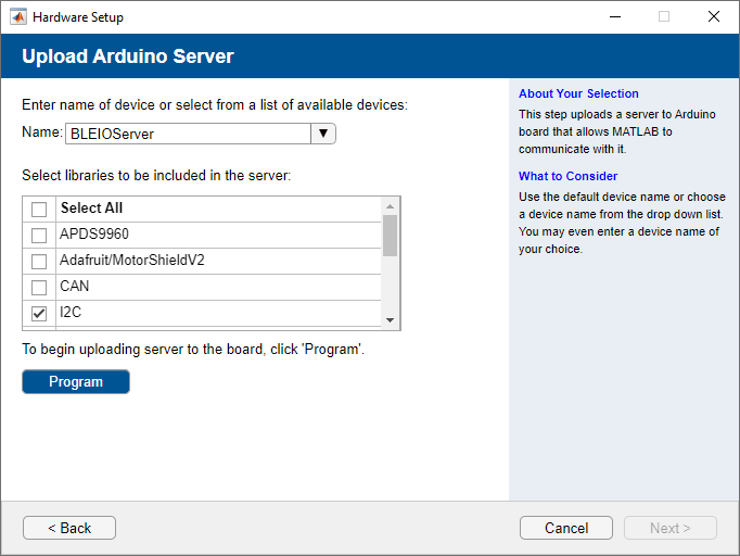 Select the libraries that you want to include in your Arduino server. Click Program to begin uploading the server to your Arduino board.