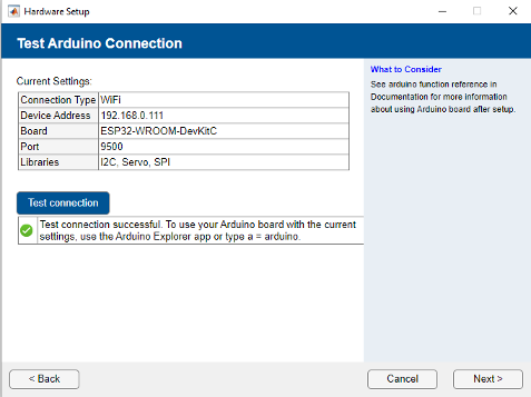 ESP32-DevKitV1orESP32-DevKitCboards over Bluetooth.Click Test connection to test the connection between your host computer and the Arduino board and click Next.