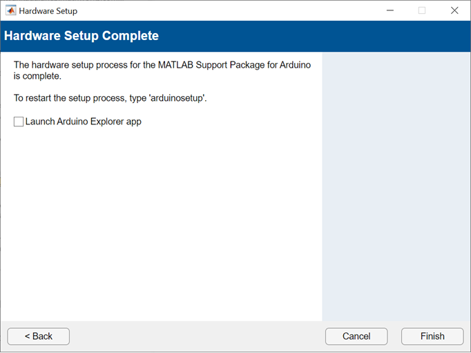 Click Finish to complete the hardware setup. To connect to your ESP32 board, see Connect to Arduino Hardware.