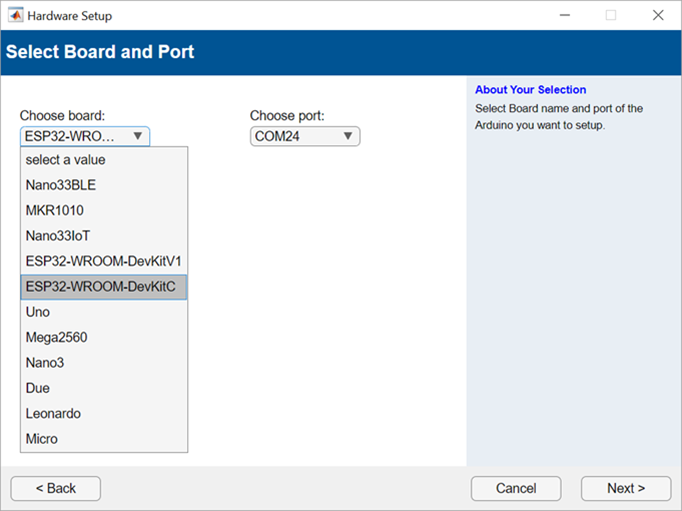 between the host computer and the ESP32 board. Type arduinosetup in the MATLAB Command window and choose one of the following connection types.