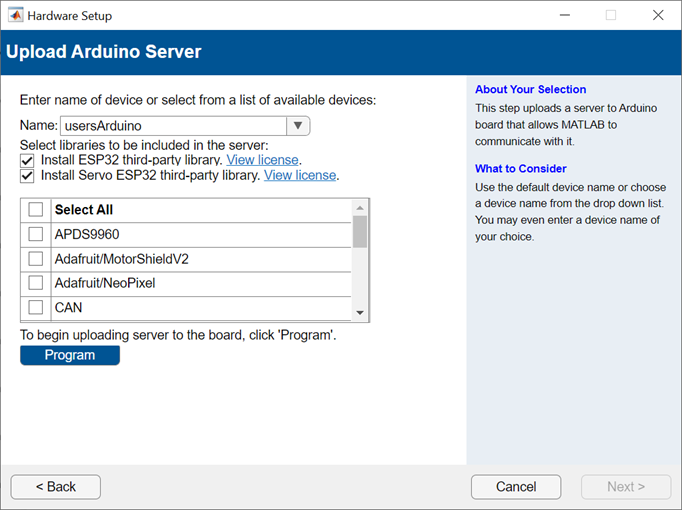 Select the libraries that you want to include in your ESP32 server. Click Program to begin uploading the server to your ESP32 board.