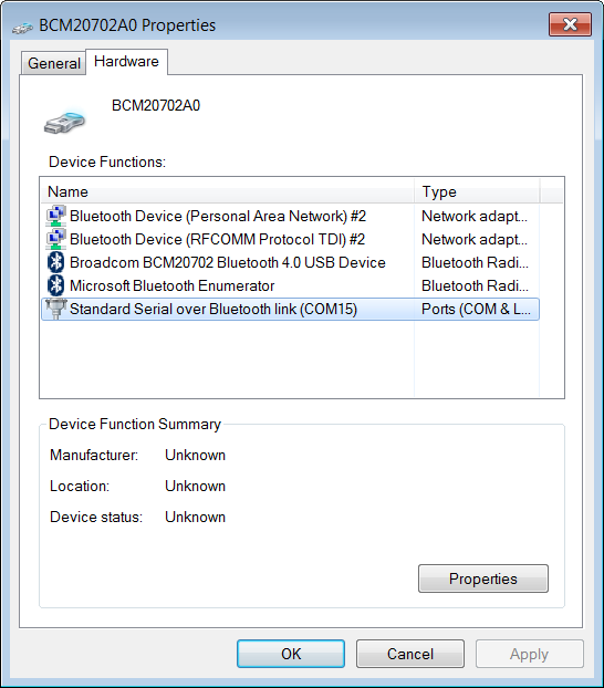 In the Properties dialog box for the Bluetooth device, read the COM port number.
