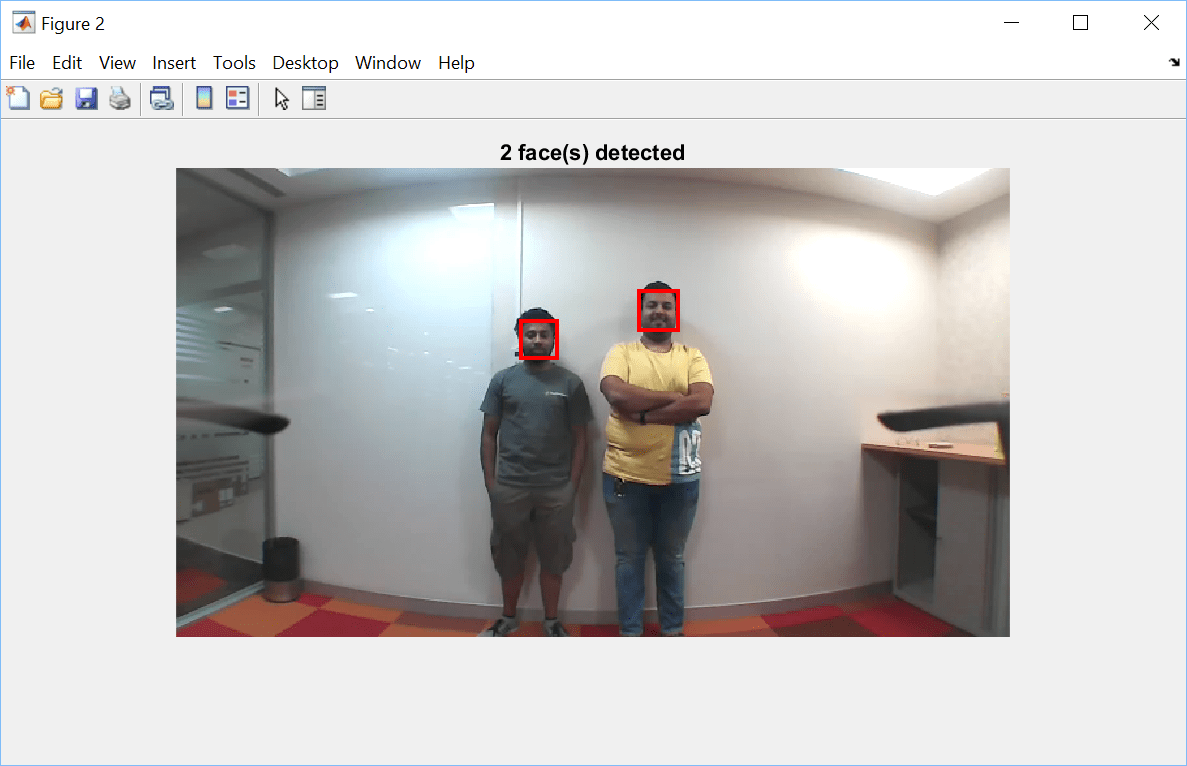 tOuter= tic; while(toc(tOuter)<=30 && parrotObj.BatteryLevel>20) tInner = tic; % Keep moving the drone for 2 seconds along each square path edge while(toc(tInner)<=2) moveforward(parrotObj); % Move the drone forward for default time of 0.5 seconds (nonblocking behaviour) picture = snapshot(camObj); % Capture image from drone's FPV camera bbox = detector(picture); % Detect faces in image videoOut = insertShape(picture,'Rectangle',bbox,'Color','r','LineWidth',3); % Insert bounding box into image imshow(picture); % Show the picture title(sprintf(' %d face(s) detected ',size(bbox,1))); drawnow; end turn(parrotObj,deg2rad(90)); % Turn the drone by pi/2 radians end