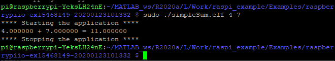 When you generate code for adding numbers the Raspberry Pi support package builds the executable on the hardware. You can then provide inputs to the executable as command line arguments. The executable adds the numbers and displays the output on the Raspberry Pi Linux® terminal.