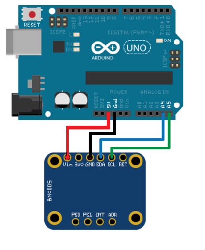 Connect the SDA, SCL, GND, and the VCC pins of the BNO055 sensor to the corresponding pins on the Arduino hardware. This example uses an Arduino Uno board with the following connections: