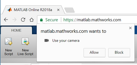 webcamlistor if you blocked permissions, follow the instructions for Google Chrome to allow the MATLAB Online website access to the camera.Make sure that your camera is not being used by another website or another application.