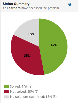 The following image shows an example status summary graph. In it, you can see that 17 learners have looked at or worked on the assessment item. From that 17, 47 percent (8 learners) solved the assessment item, 35 percent (6 learners) did not, and no solutions were submitted by 18 percent (3 learners).