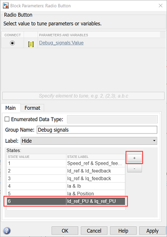 Double-click the Debug signals radio button to open the block parameters dialog box. Add a new state value (for example,