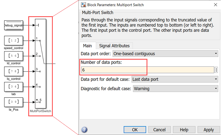 Open the block parameter dialog box of the Multiport Switch block and set the Number of data ports parameter to the number of debug signal pairs now available in the host model (for example, change the value from
