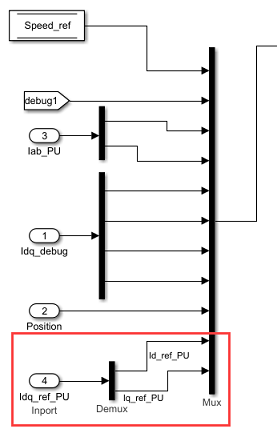 Connect the new signals (for example, Id_ref_PU and Iq_ref_PU) to the new mux ports that you added in step 4.