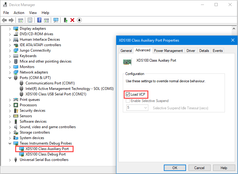 Right-click XDS100 Class Auxiliary Port Properties and select Properties. Navigate to Advanced tab and select Load VCP.
