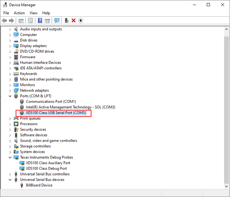 Look for an entry under Ports (COM & LPT) titled USB Serial Port (COMX), where X is a number. If there are multiple COM ports, you can disconnect and reconnect the C2000 board and observe the updates in Device Manager to determine the COM port.