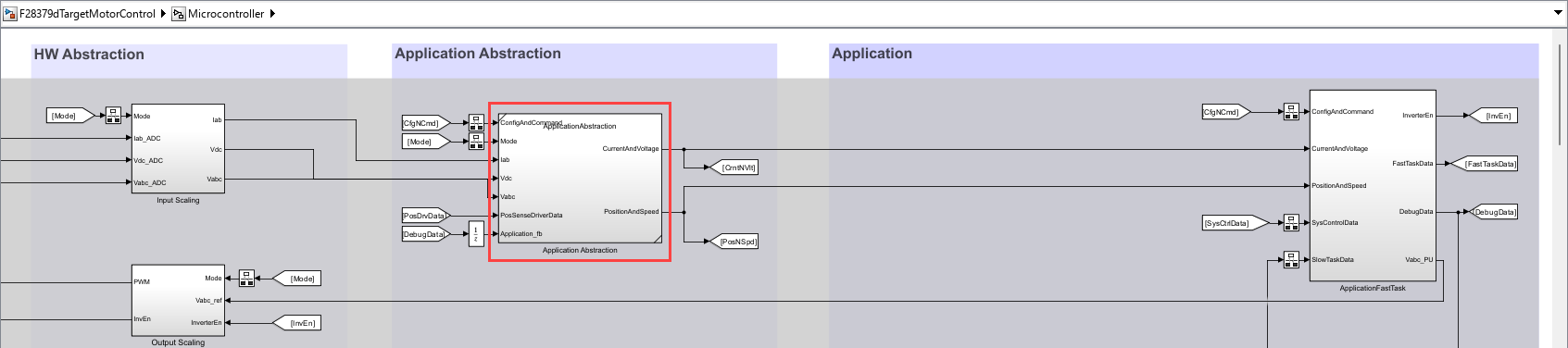 Application Abstractionsubsystem in the base hardware modelF28379dTargetMotorControl.slxis a subsystem reference, ensure that you do not change the following connections:Connections between