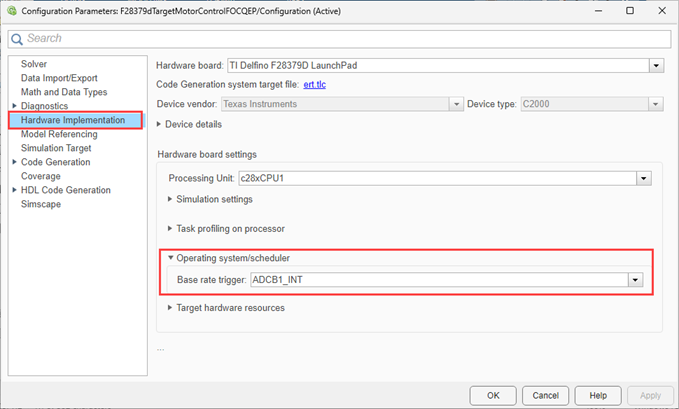 F28379dTargetMotorControl.slxfor theTI F28379D Launchpadhardware target to use the existing processor architecture as a base.Follow the instructions for Scenario 2 of the Modify Inverter section to update the configuration settings of the copied base hardware model according to the new processor. In addition, update the device drivers for the new processor.