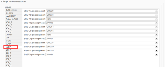 For example, use the eQEP tab of the Target hardware resources section to update the pin configuration for the quadrature encoder sensor as shown in the following figure.