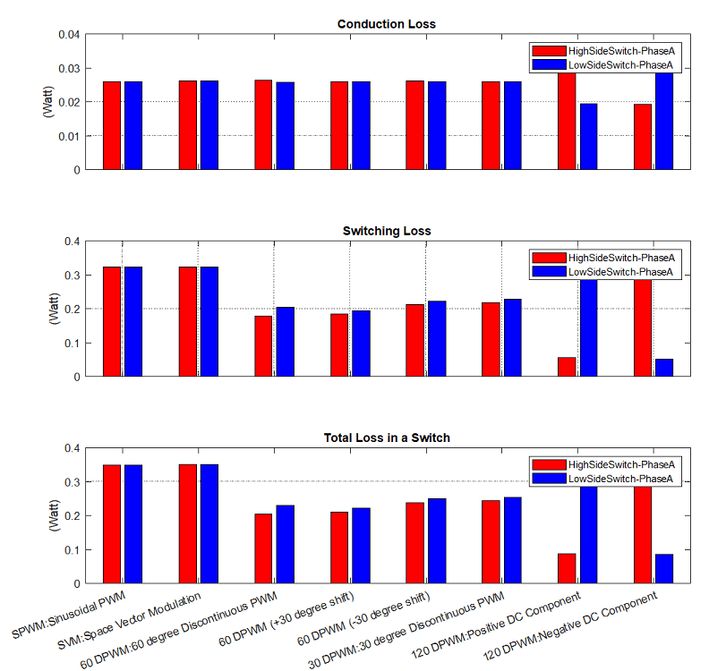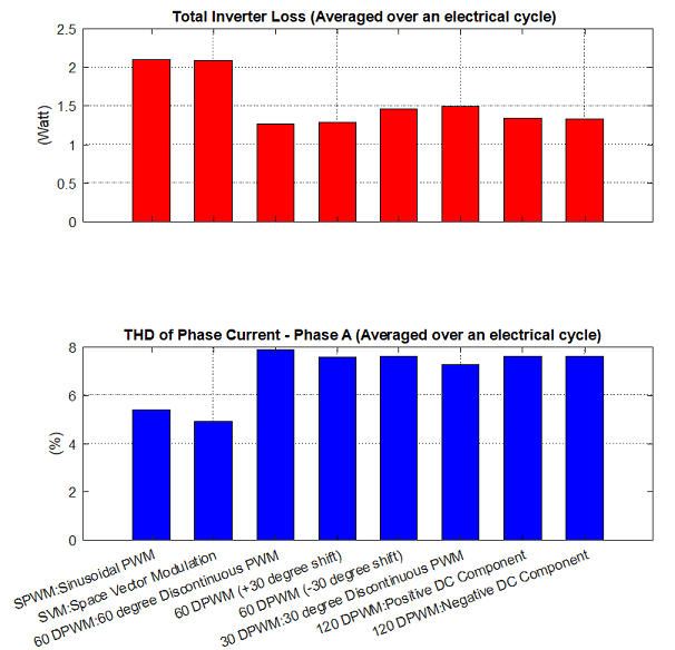 After the simulation completes, the script mcb_InverterLossTHDExtract.m uses the simulation data available in the MATLAB® workspace to generate the power loss in the inverter switches and motor current THD plots for the different PWM methods.