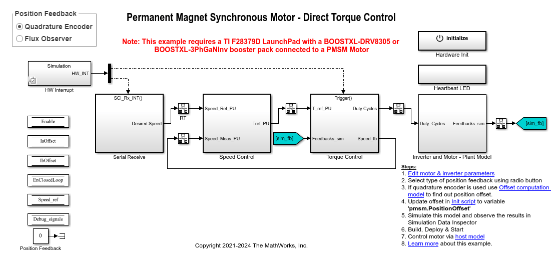 The example enables you to use either quadrature encoder sensor or sensorless flux observer to determine the rotor position. For details about the Flux Observer Simulink® block, see Flux Observer.