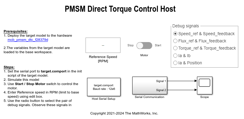 This example uses a host and a target model. The host model is a user interface to the controller hardware board. You can run the host model on the host computer. Before you can run the host model on the host computer, deploy the target model to the controller hardware board. The host model uses serial communication to command the target Simulink model and run the motor in closed-loop control.