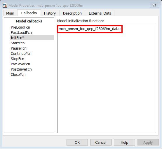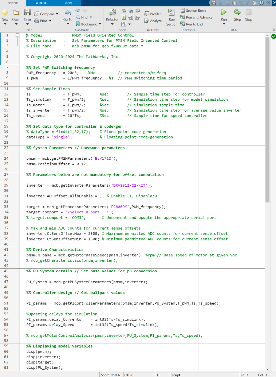 Model Initialization Script Function Called By Model Initialization Script Description Script associated with a target model mcb.getPMSMParametersInput to the function is the type of PMSM (for example, BLY171D).