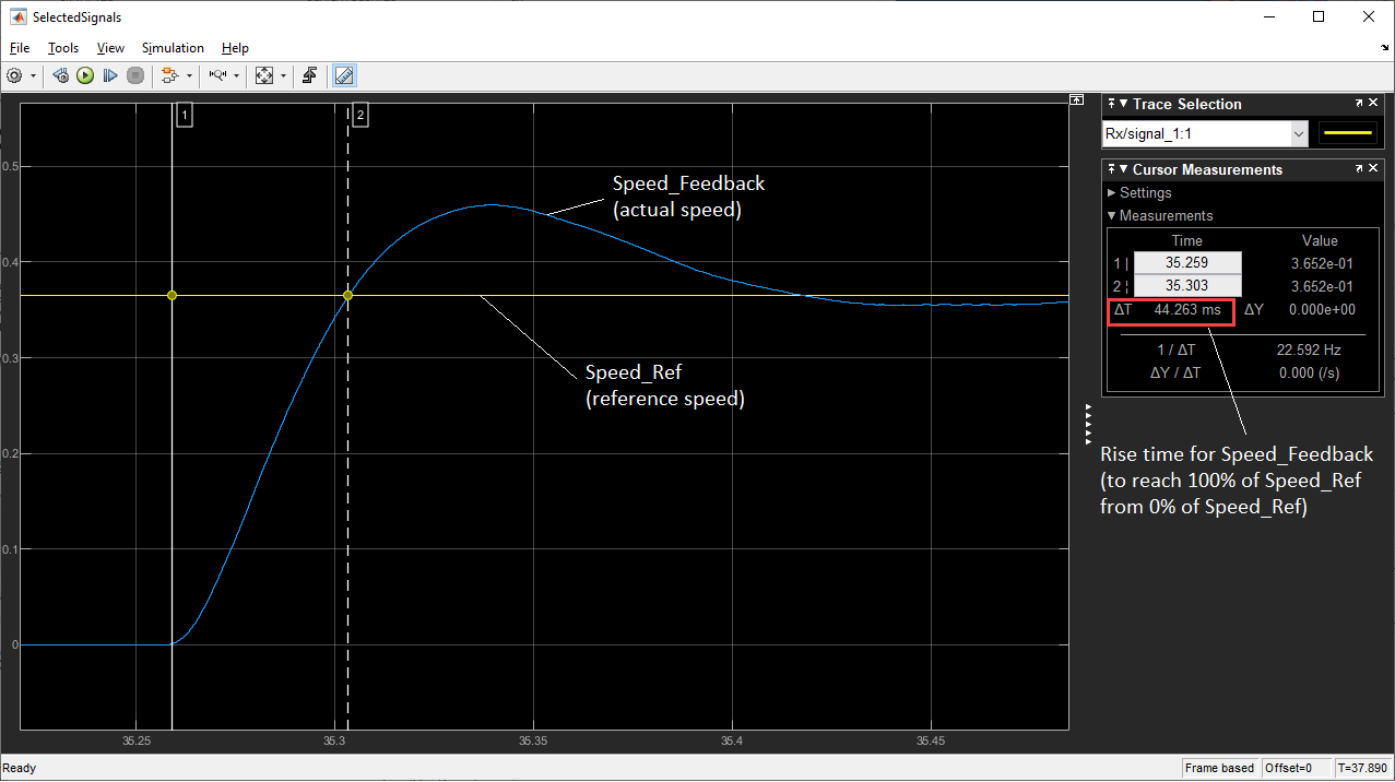 6. Drag cursor-1 to a position that indicates zero Speed_Ref (just before Speed_ref rises). Drag cursor-2 to a position where Speed_Feedback meets Speed_Ref for the first time.