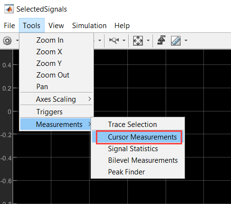 5. In the SelectedSignals window, navigate to Tools > Measurements and select Cursor Measurements to display the Cursor Measurements area.