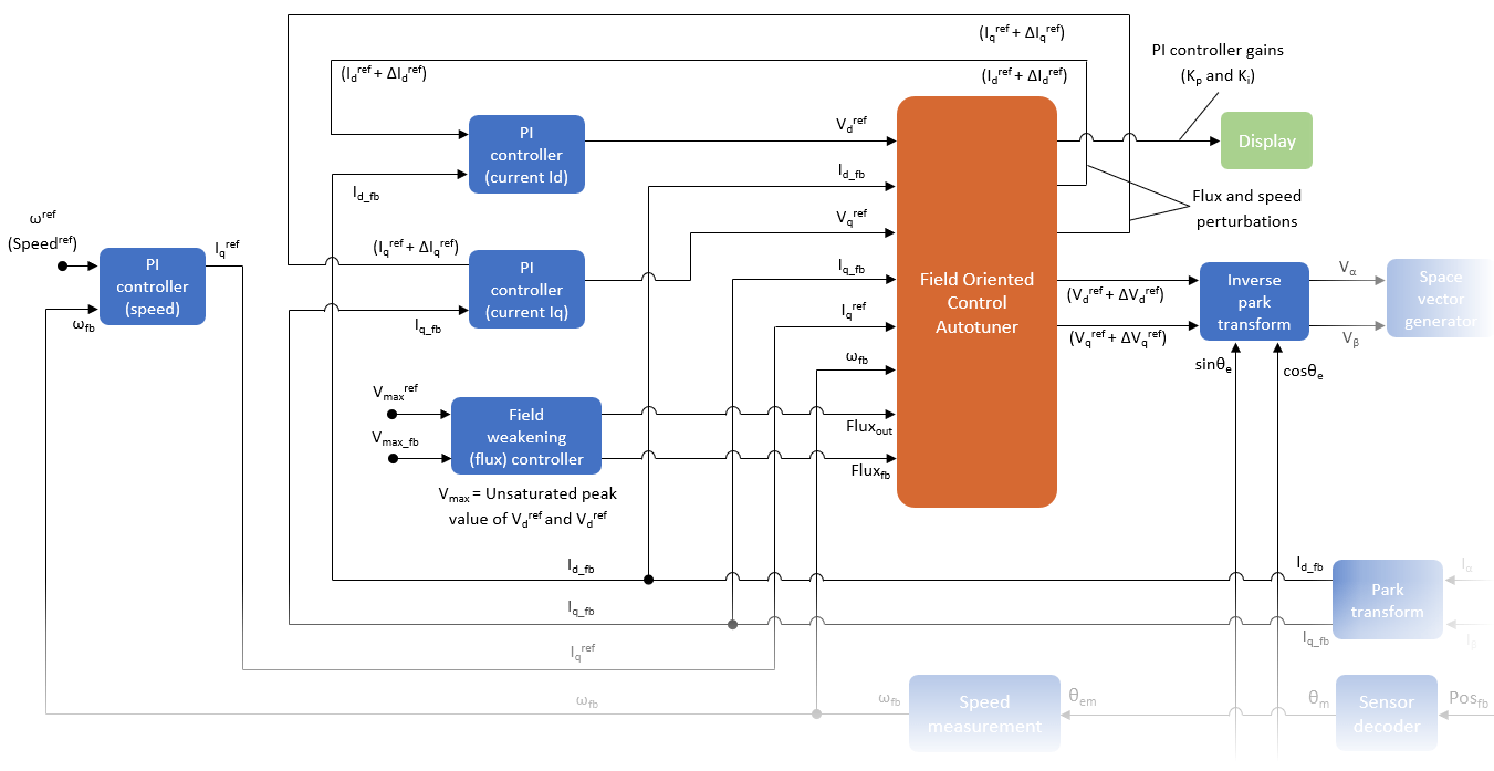The Field Oriented Control Autotuner block iteratively tunes the d- and q-axis current control, speed and flux control loops and computes the gains of the current, speed, and flux PI controllers. The following figure shows the Field Oriented Control Autotuner block available inside the model: