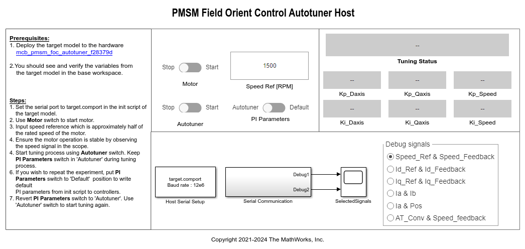 3. Configure these parameters correctly in the model initialization script. These variables are essential for the gain-tuning algorithm to compute the PI controller gains. If the values of these variables are incorrect, the model may fail to bring the motor to the steady speed state.