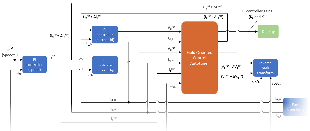 Note: This example uses the field-oriented control algorithm as a reference. You can refer this example and use a similar approach to add the Field Oriented Control Autotuner block and the gain-tuning algorithm to the FOC logic available in your model.