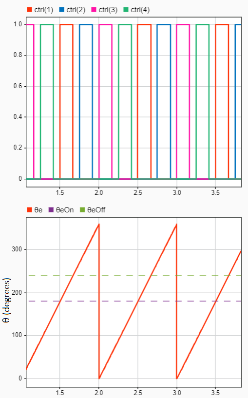 Each pulse in a switching sequence represents the activation period of the phase. The range of motor positions for which a phase activates is known as the dwell angle, θdwell = θeOff – θeOn. When the motor electrical position falls within the dwell angle of a phase, the block outputs 1 to activate this phase.