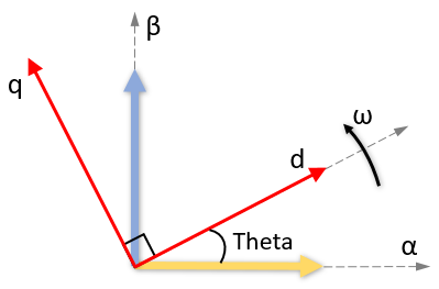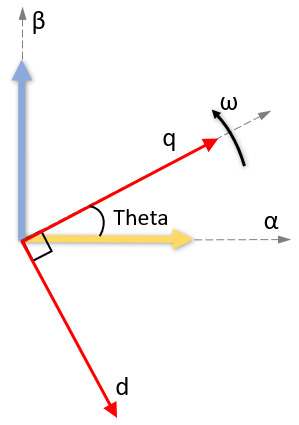 Theta is the angle between the α- and d-axes for the d-axis alignment or the angle between the α- and q-axes for the q-axis alignment. It indicates the angular position of the rotating dq reference frame with respect to the α-axis.