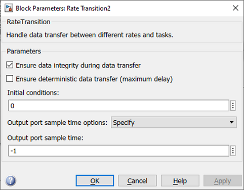 3. Integrate the speed controller subsystem (that you created in step 2) with the integrated current controller and plant model subsystems. Connect the Iq_ref_PU output port of the speed controller subsystem to the current controller subsystem input port through a Rate Transition block. The Rate Transition block is needed because the two ports execute at different sample rates. This figure shows an example of the parameter settings of the Rate Transition block connected to the speed controller and the current controller subsystems.