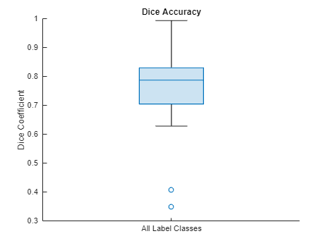 Visualize statistics about the Dice indices across all the label classes as a box chart. The middle blue line in the plot shows the median Dice index. The upper and lower bounds of the blue box indicate the 25th and 75th percentiles, respectively. Black whiskers extend to the most extreme data points that are not outliers.