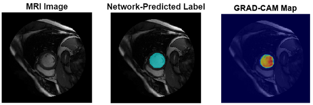 This figure shows an example of a cine-MRI image before segmentation, the network-predicted segmentation map, and the corresponding Grad-CAM map.