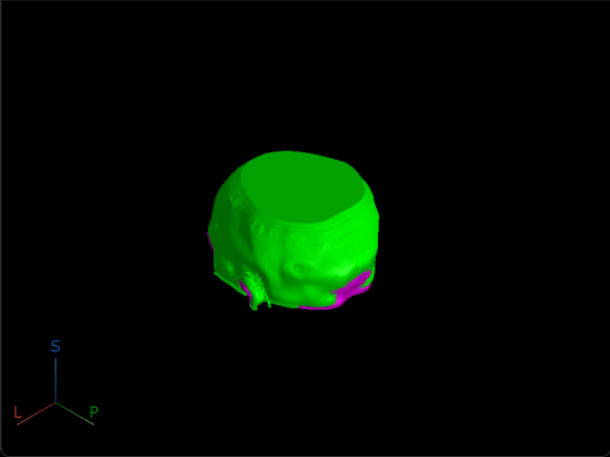 viewer = viewer3d(BackgroundColor="black",BackgroundGradient="off"); volshow(fixedMRIVolume,Parent=viewer,RenderingStyle="Isosurface", ... Colormap=[1 0 1],Alphamap=1); volshow(movingReg.regVol,Parent=viewer,RenderingStyle="Isosurface", ... Colormap=[0 1 0],Alphamap=1);