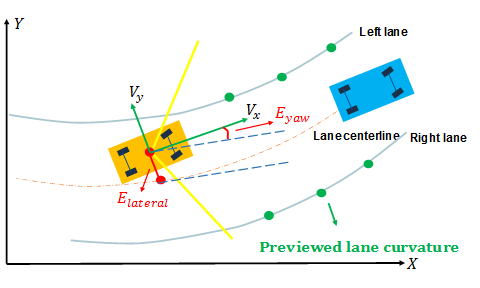Here, θe is the ego vehicle angle and θc is the centerline angle, with both angles defined in the global coordinate frame.