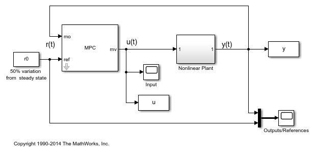 The nonlinear plant is implemented in the Simulink model mpc_nloffsets and linearized at the default operating condition using the linearize function from Simulink Control Design™.