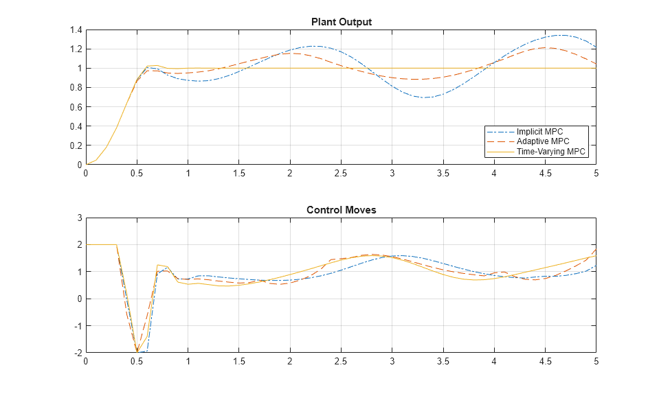 t = 0:Ts:Tstop; figure subplot(2,1,1); plot(t,yyMPC,'-.',t,yyAMPC,'--',t,yyLTVMPC); grid legend('Implicit MPC','Adaptive MPC','Time-Varying MPC', ... Location="SouthEast") title('Plant Output'); subplot(2,1,2) plot(t,uuMPC,'-.',t,uuAMPC,'--',t,uuLTVMPC) grid title('Control Moves');