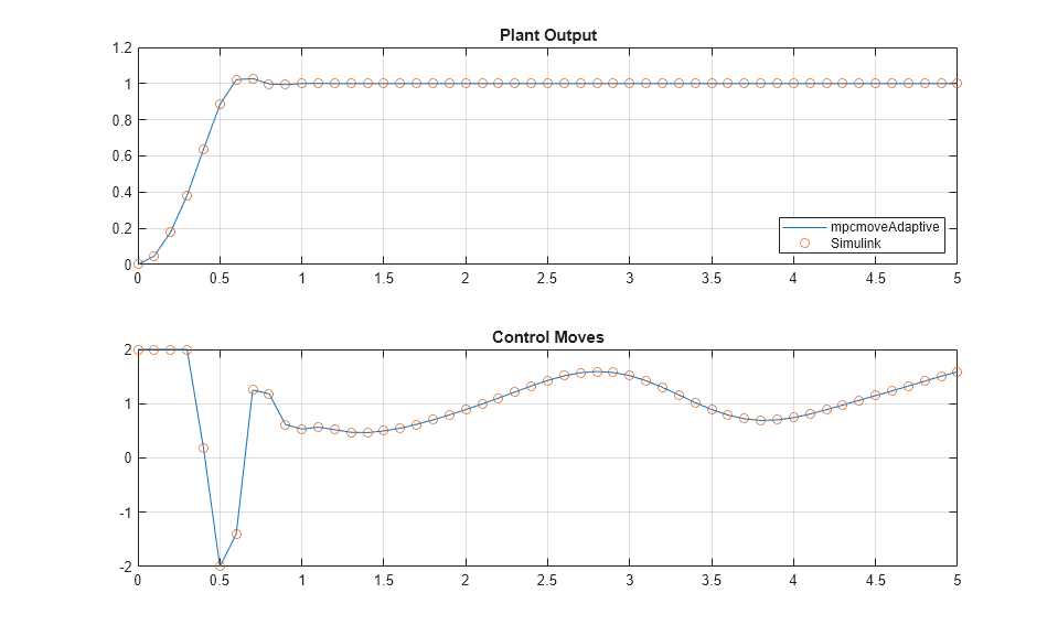 figure subplot(2,1,1) plot(t,yyLTVMPC,t,ysim,'o'); grid legend('mpcmoveAdaptive','Simulink','Location','SouthEast') title('Plant Output'); subplot(2,1,2) plot(t,uuLTVMPC,t,usim,'o') grid title('Control Moves');