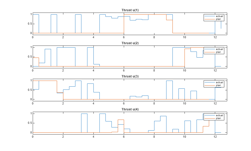 Also, to reduce fuel consumption, it is clear that u1 and u2 cannot be positive at any time during the operation. Therefore, implement equality constraints such that u(1)*u(2) must be 0 for all prediction steps. Apply similar constraints for u3 and u4.