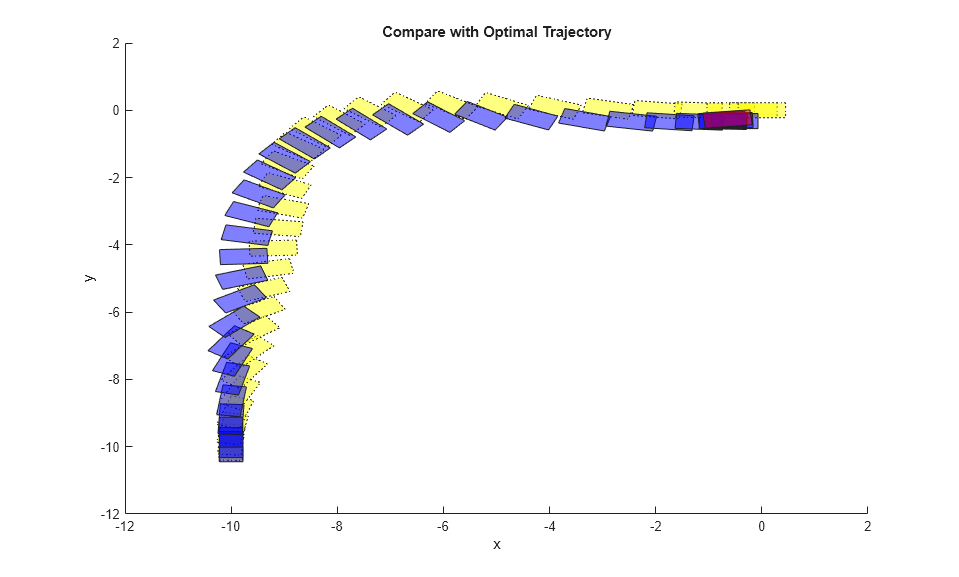 The nonlinear MPC feedback controller successfully moves the robot (blue blocks), following the optimal trajectory (yellow blocks), and parks it at the final location (red block) in the last figure.